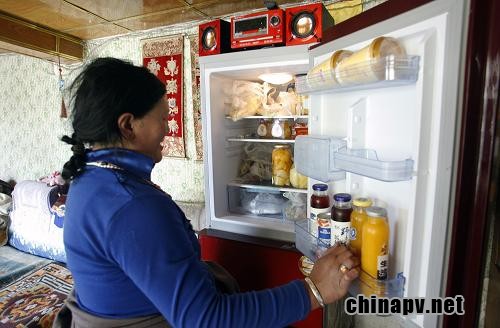 达日县建设乡的藏族牧民哲落在自家电冰箱取物(4月3日摄)