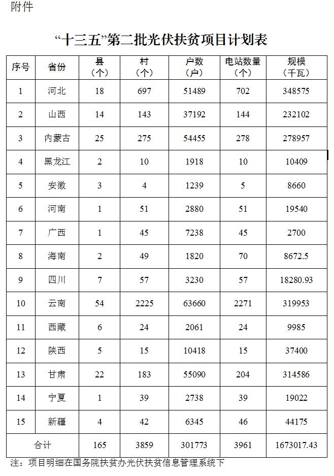 为贯彻落实《中共中央 国务院关于打赢脱贫攻坚战的决定》和《中共中央 国务院关于打赢脱贫攻坚战三年行动的指导意见》精神,扎实有序推进光伏扶贫工作,在各?。ㄇ┥瓯ü夥銎断钅康幕∩?,经国务院扶贫办、国家能源局联合审核,现下达“十三五”第二批光伏扶贫项目计划,有关事项通知如下。