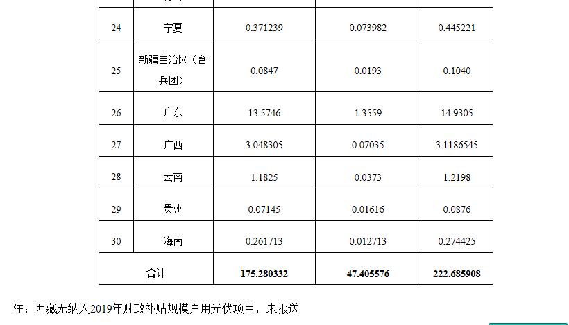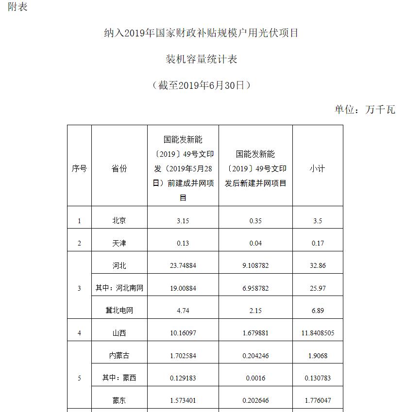 按照《国家能源局关于2019年风电、光伏发电项目建设有关事项的通知》(国能发新能〔2019〕49号,以下简称《通知》)和《关于2019年户用光伏项目信息公布和报送有关事项的通知》(国能综通新能〔2019〕45号)关于户用光伏项目管理有关要求,根据各省级能源主管部门、电网企业报送信息,经国家可再生能源信息管理中心(以下简称信息中心)梳理统计,全国共有30个省份报送了户用光伏项目信息(西藏无纳入2019年财政补贴规?;в霉夥钅?,未报送)。