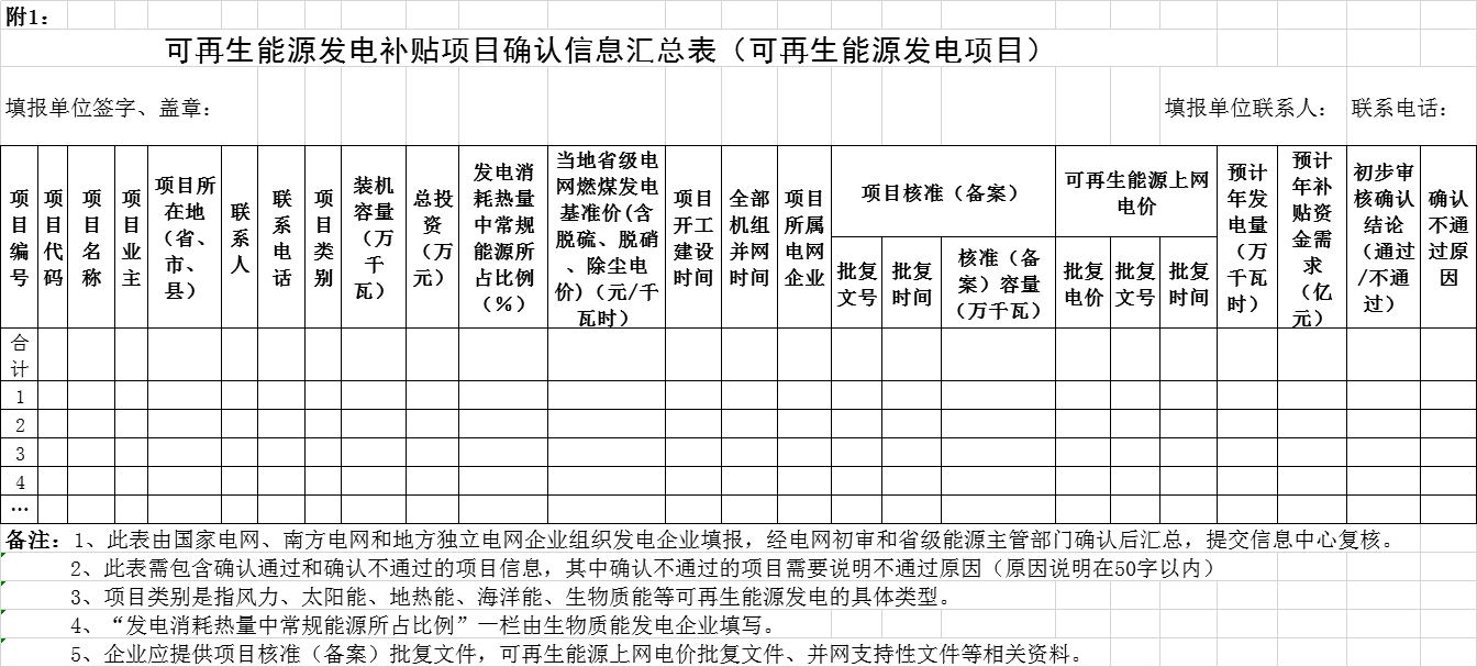 在完成电网企业初审和省级能源主管部门确认后,请国家电 网、南方电网、内蒙古电力公司和地方独立电网企业组织经营范 围内的电网企业对申报项目信息和支持性文件进行汇总,形成 《可再生能源发电补贴项目确认汇总表》(见附件2),并通过信 息平台在线提交至信息中心进行复核,同步上传汇总表盖章扫描 件。